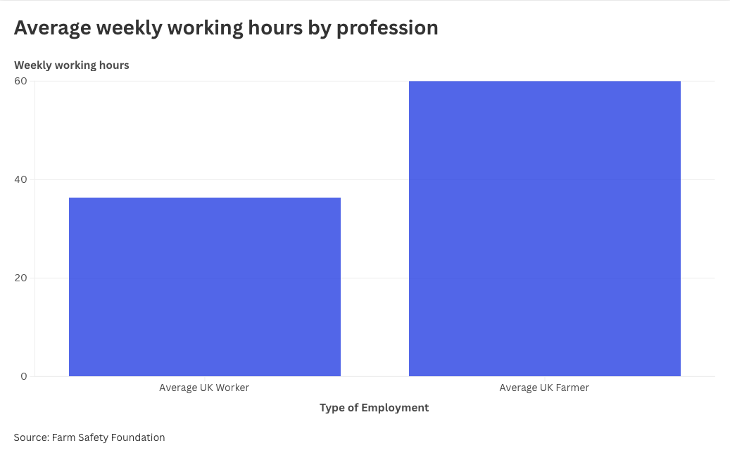 According to the Farm Safety Foundation, a charity working to address the attitudes and behaviours to farm safety and poor mental health, the average farmer works almost double the weekly hours of the average full-time worker in the UK.
