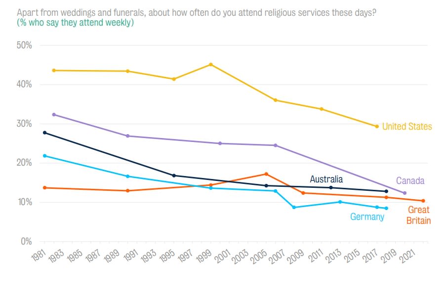 This decline in conventional religious belief is evident in the data showing the decline in religiosity and the attendance of religious services; only 11 per cent of people in the UK say they attend religious services weekly.