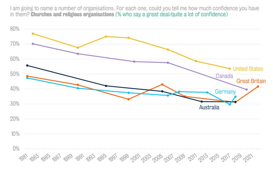 A further surprising finding of the survey was the slight rebound in confidence in churches and religious organisations, rising from 31 per cent to 42 per cent. There is speculation that this is due to the positive perception of the social and charitable activities of churches in their local communities both during and after the pandemic. Professor Voas remains wary however, pointing to the findings of the European Values Study he led in 2018.