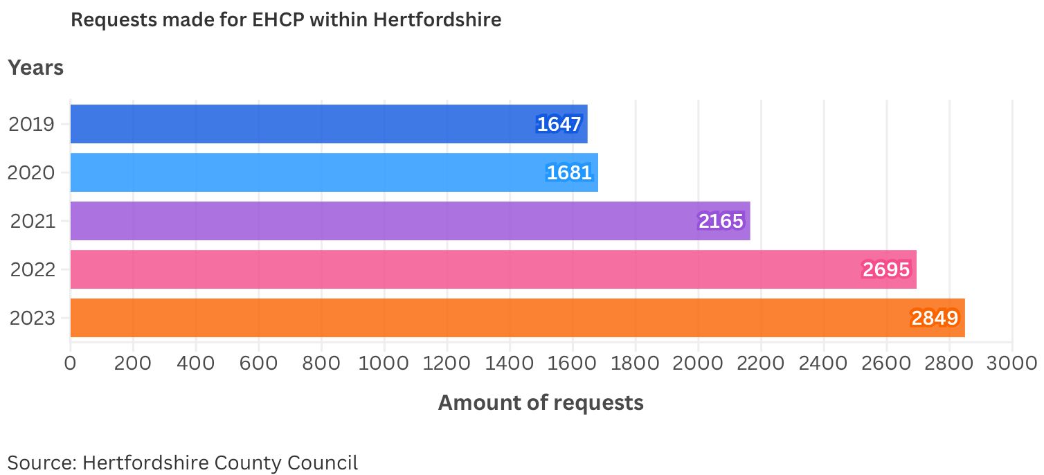 Graph showing the requests made for EHCP within Hertfordshire from 2019 to 2023 created on flourish