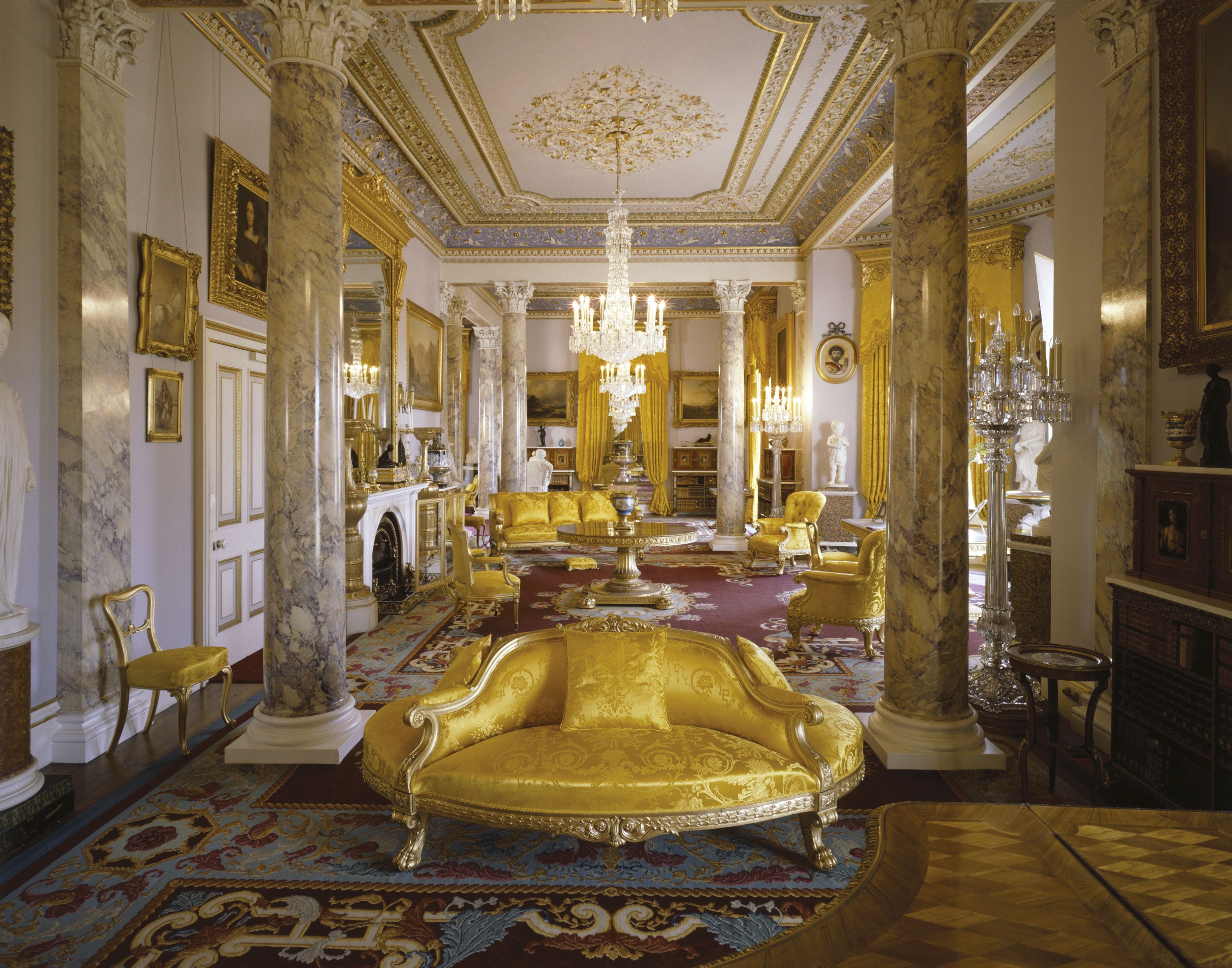 Looking at the Drawing Room columns that separate the room into functional zones, they appear to be marble. In fact, they are faux marble, a painted technique known as scagliola (pronounced "ska-LYOH-luh" in American English and "skal-YOH-luh" in British English, with the emphasis on the second syllable). This technique makes plaster look like marble. It was invented in Italy in the 1600s and became popular in grand houses and churches across Europe.