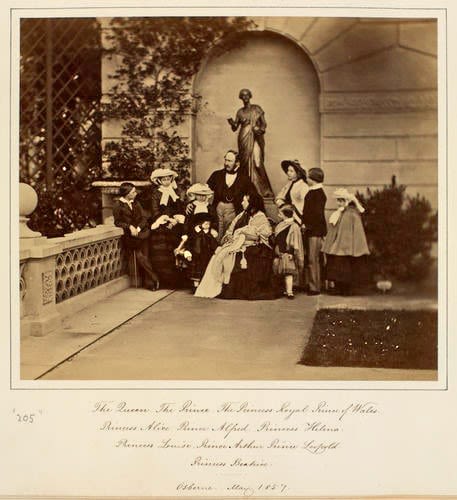 Photo credit: Royal Collection, Osborne House, The Royal Family on terrace at Osborne 26 - 26 May 1857 Photograph of The Royal Family on the terrace at Osborne. From left to right: Prince Alfred, Princess Alice, Princess Helena, Prince Leopold, Prince Albert, the Queen holding Princess Beatrice, Prince Arthur, Princess Royal, Prince of Wales and Princess Louise. Statue of Urania in alcove in the background.