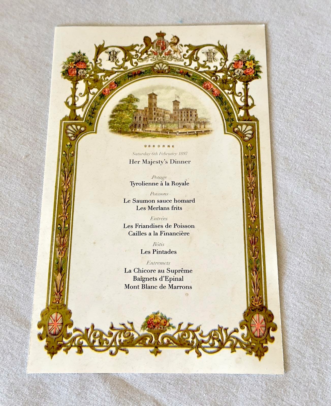 Photo credit: Kitt Garrett, English Heritage, Osborne House, Durbar Room menu, Saturday, 6th of February 1897.