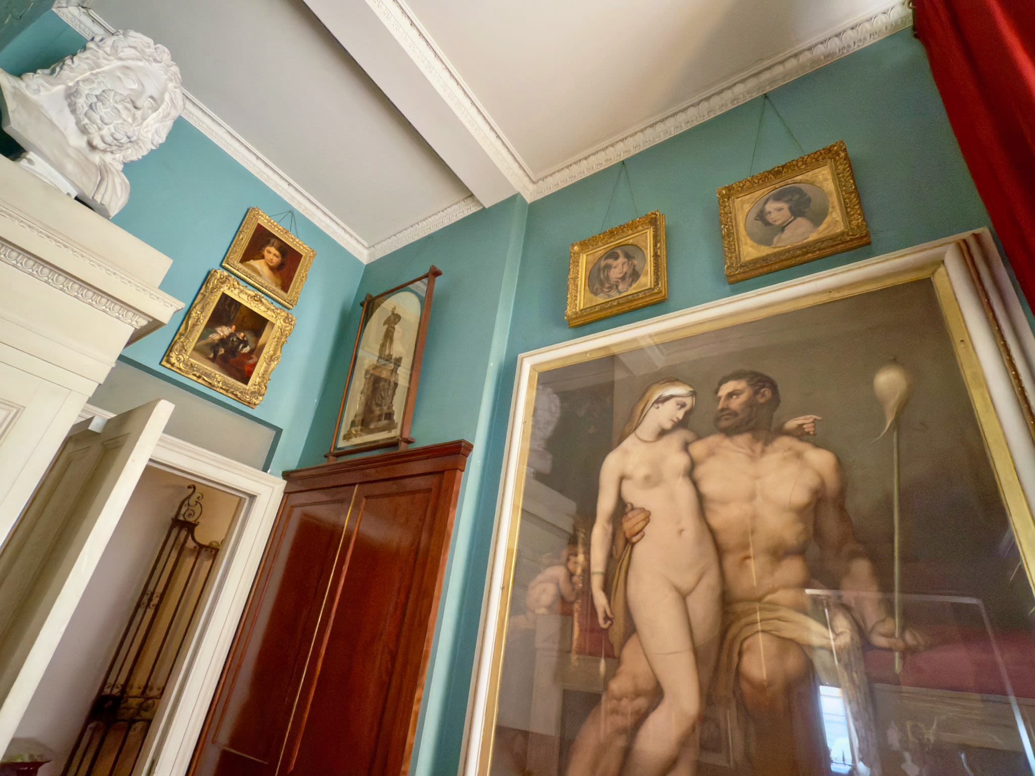 To the left of the hall door to the bathroom, a bust of Jupiter looks down.