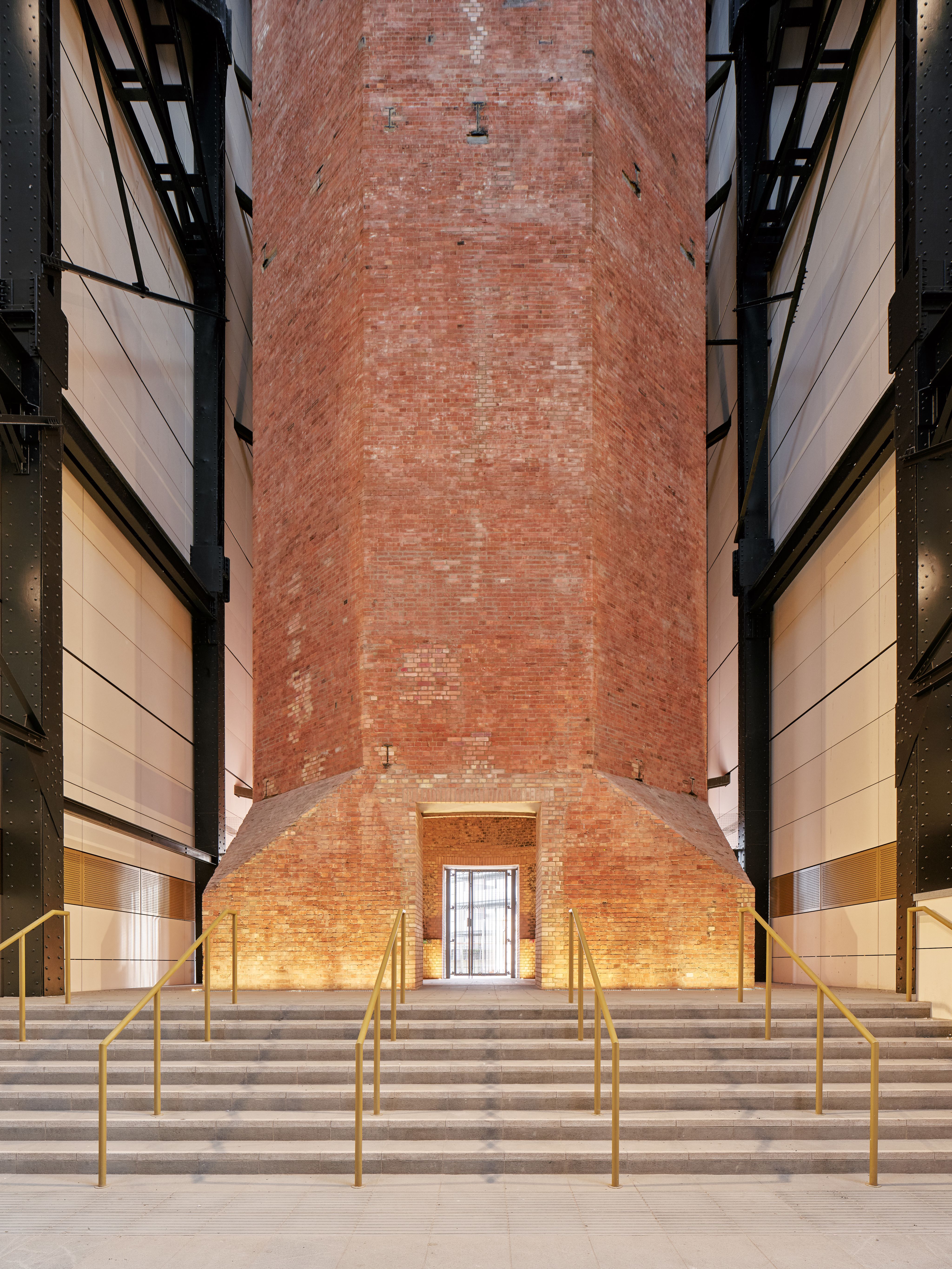 The building has maintained features of its industrial past. The red brick chimneys will be open to the public walk under and to looking up to the sky through.