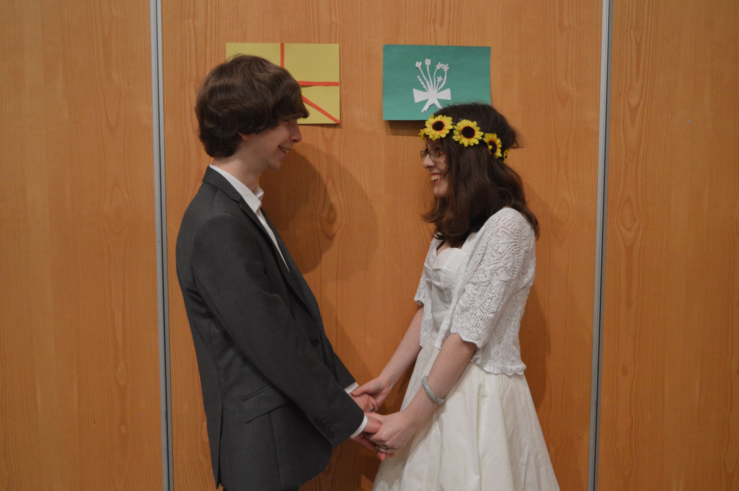 Emperor Jonathan I and Princess Hannah of Wildflower Meadows at their engagement party under their respective flags