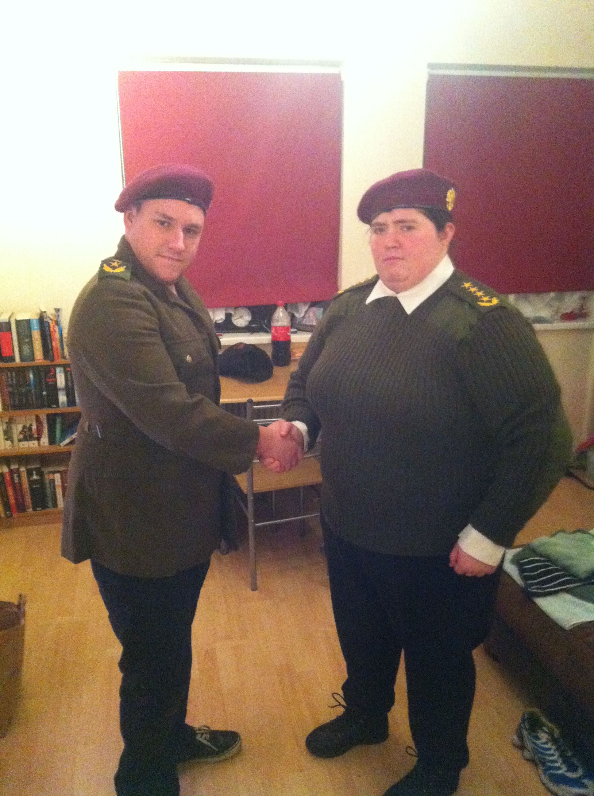 Prime Minister Mike Lewis shakes hands with the Minister of Defence after a successful meeting