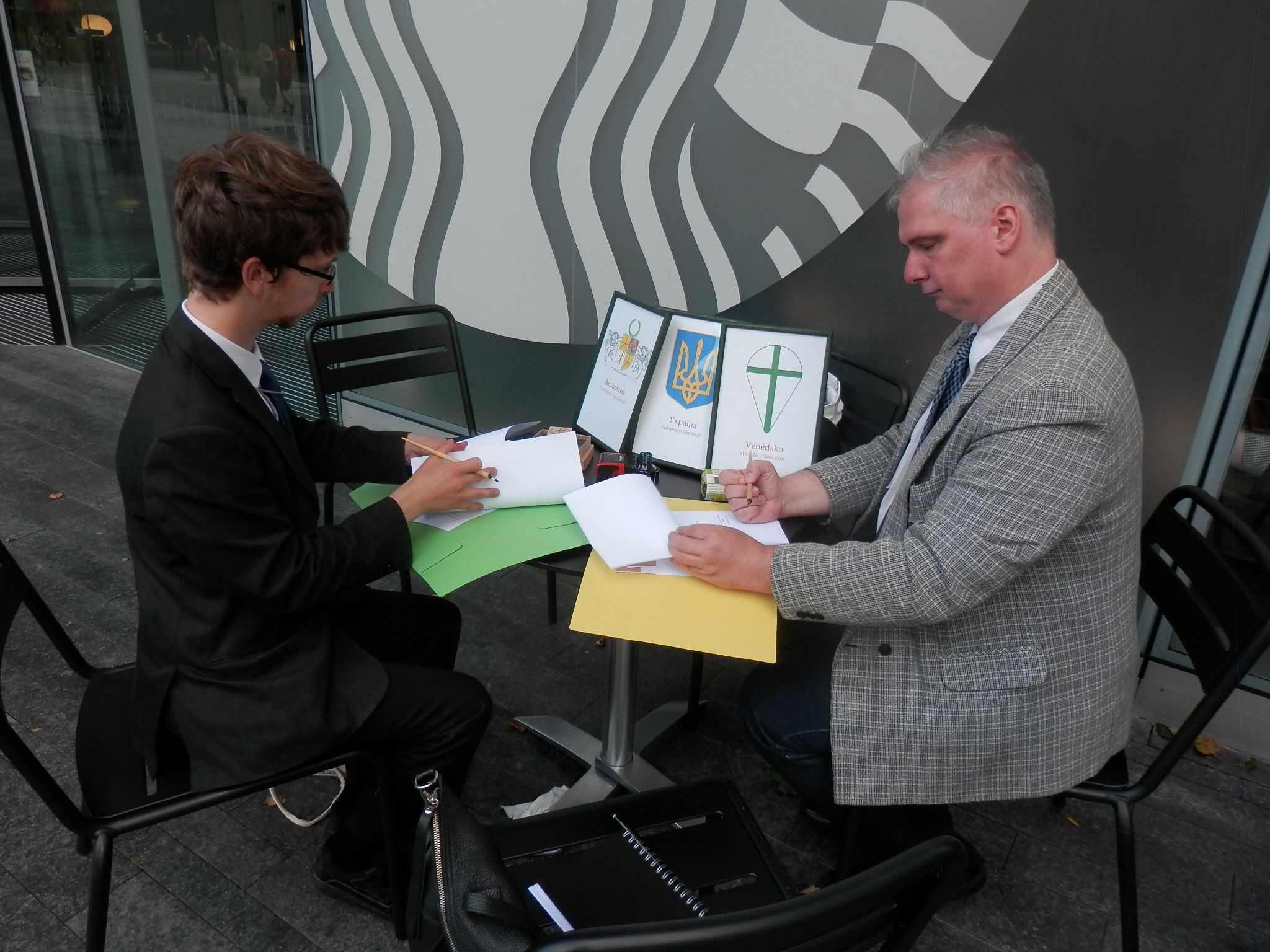 Emperor Jonathan with Jans Linhart, Magister of Venedia, signing a treaty establishing mutual recognition between the two nations
