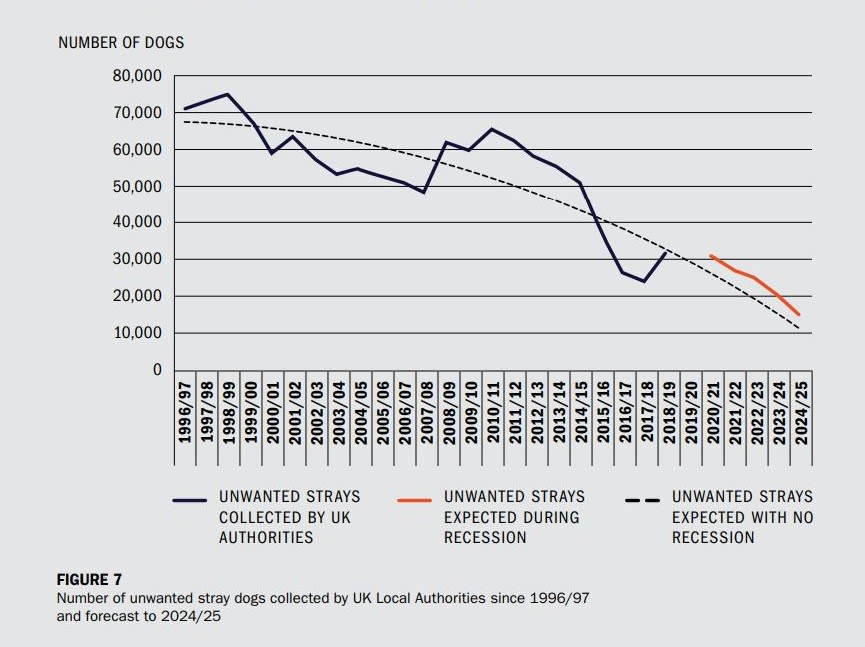 They predict that over the next five years, as a result of the Covid-19 recession, there will be 25,500 more stray dogs than they had expected.