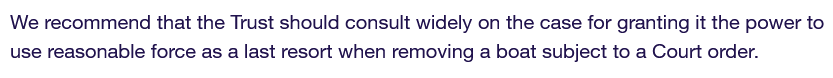 But again, Jack highlights that the use of reasonable force from a designated charity - even from the view point of evictions - brings in serious concerns about the potential abuse and unnecessary expansion of powers. Citing past issues with enforcement officers and the fact that the CRT already has powers to fine, restrict licences, evict boaters, and repossess their boats, Jack questions the motivations of the trust.