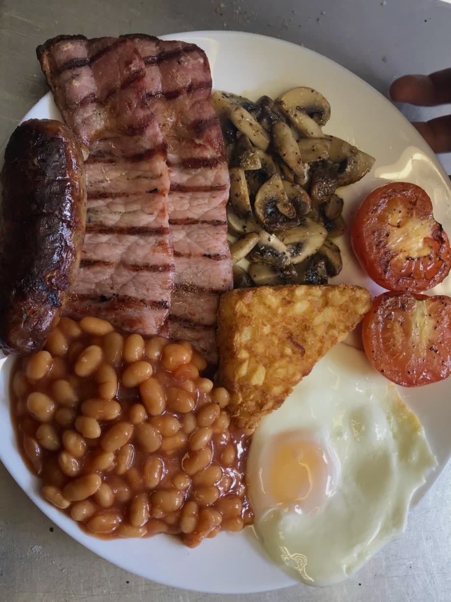 As for James’ perfect fry-up? A good quality sausage, bacon a little crispy, a good amount of beans (never in a ramekin), golden brown mushrooms, a half-tomato, hash browns, and black pudding.