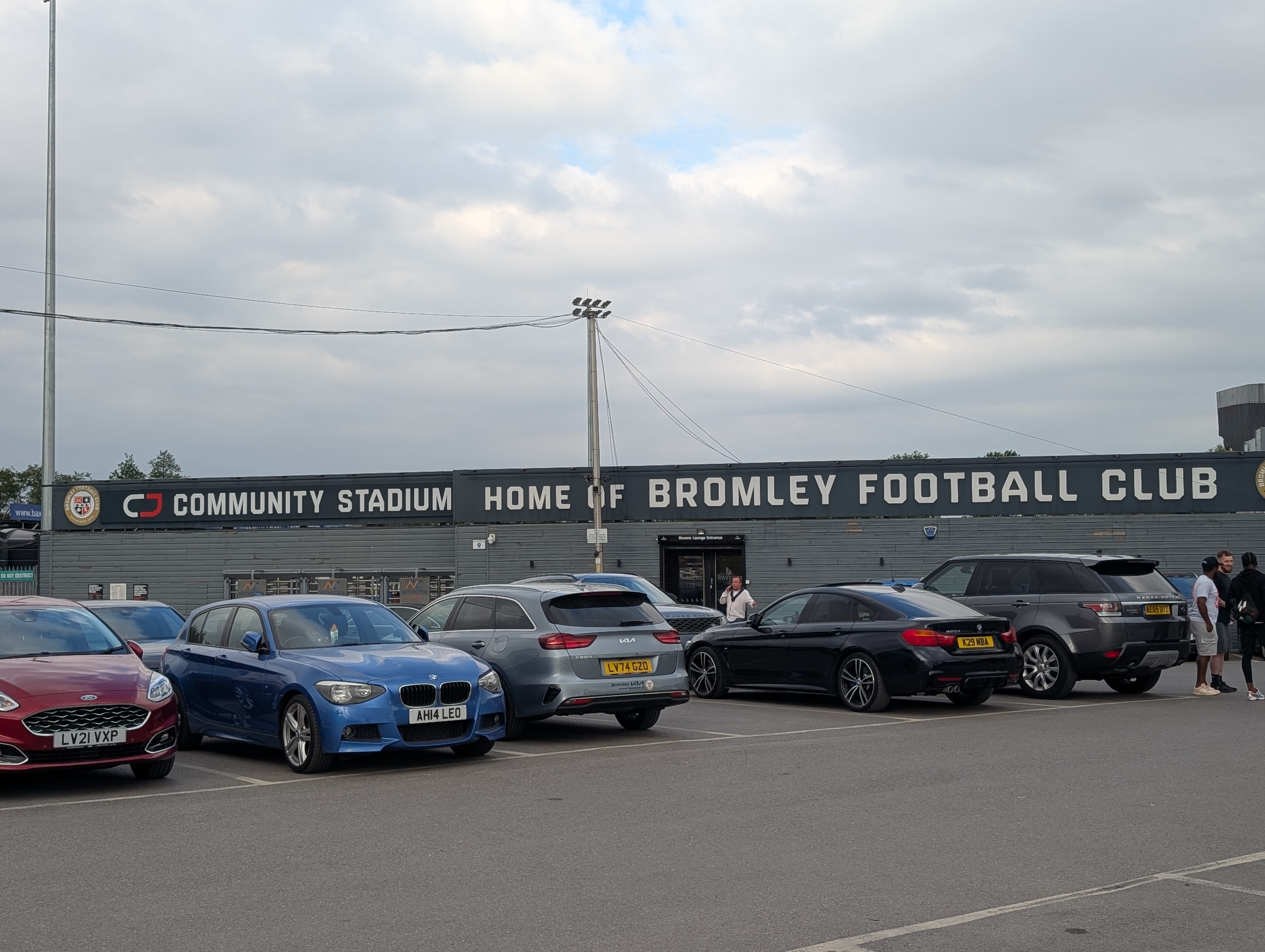 Bromley's updated exterior sign and modest car park at Hayes Lane. The neighbouring horse paddock is occasionally used on match days as overflow car parking. Image credit: Mitchell Hall