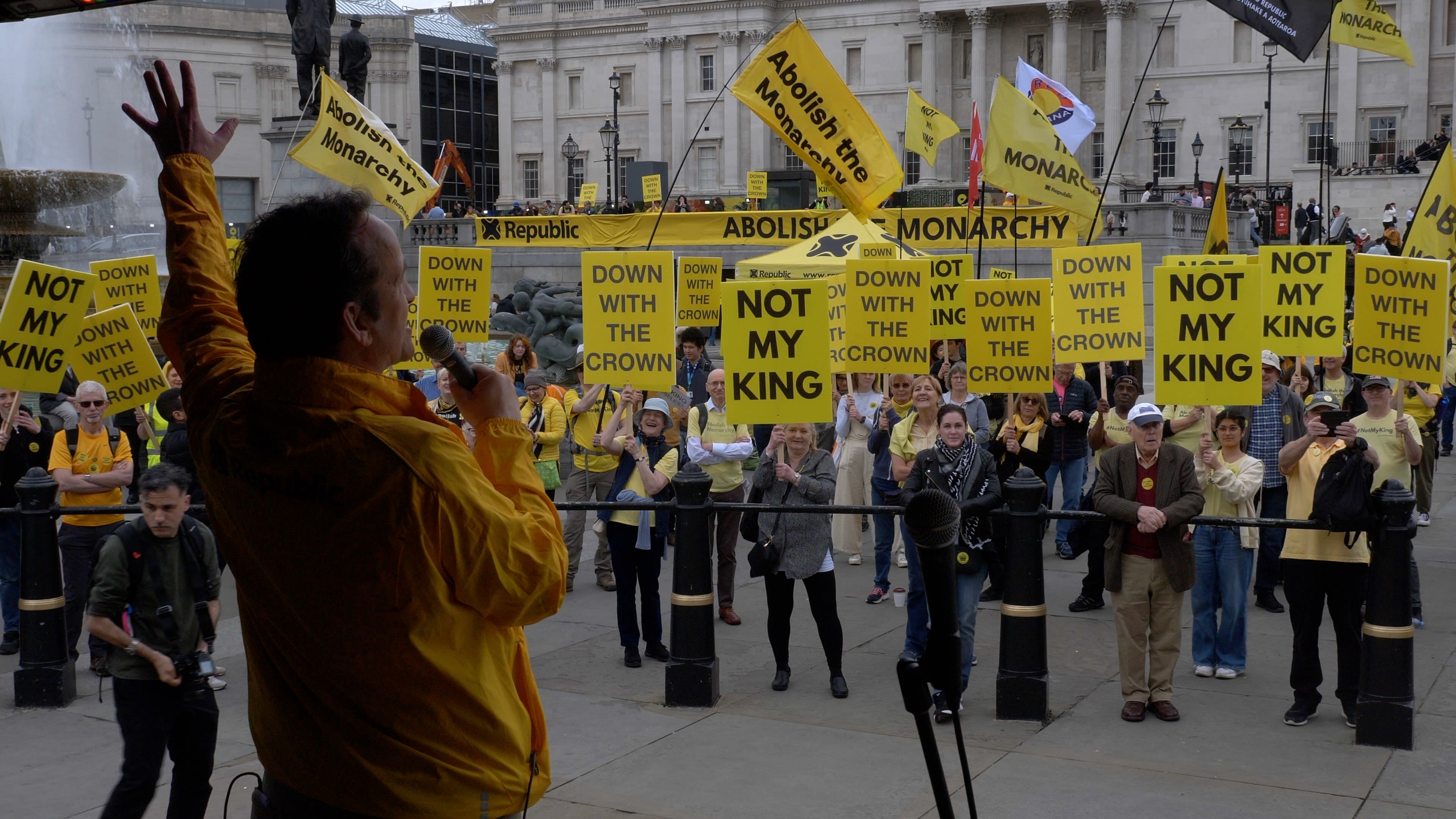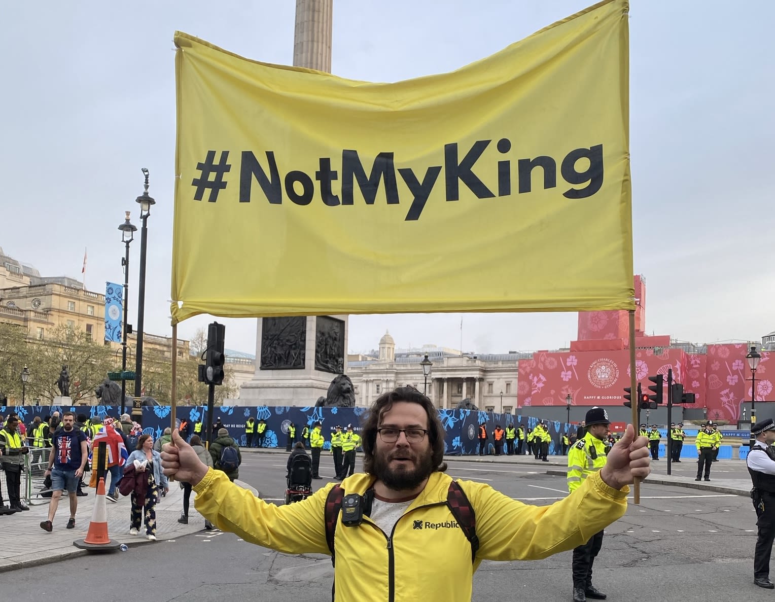 Protester during the demonstration organised by Republic for the Coronation Day in May 2023 (Credit: Ben Clinton)